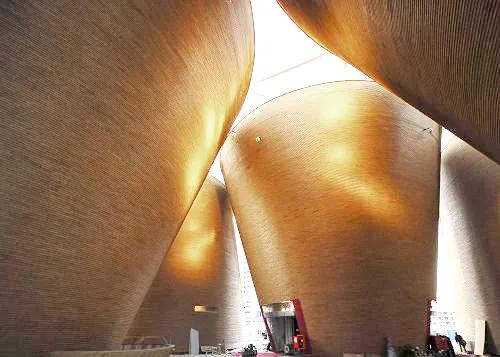 展館由七個不規(guī)則圓筒錯落排布